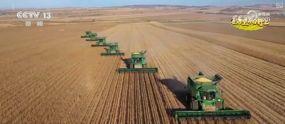 在呼倫貝爾甘河農(nóng)牧場的大豆田里,6臺大型收割機(jī)在金色的田野里繁忙作業(yè),這里地勢開闊,每臺收割機(jī)每天可收割1000畝大豆。