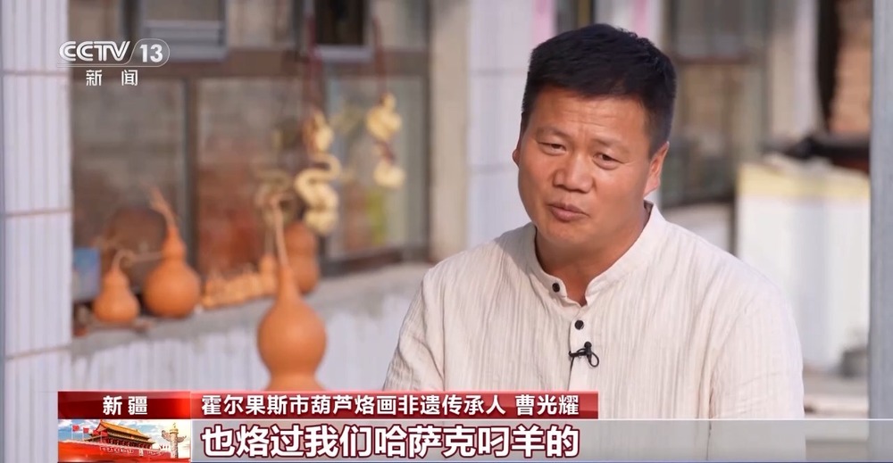 霍爾果斯市葫蘆烙畫非遺傳承人 曹光耀:特別喜歡烙我們新疆的特色,獨特之處就是說燙畫、烙畫、火筆畫它能顯出一種自然的美,它還有古色古香的古韻,特別接地氣。作為烙畫非遺傳承人,我們必須要把好的文化傳承下去。