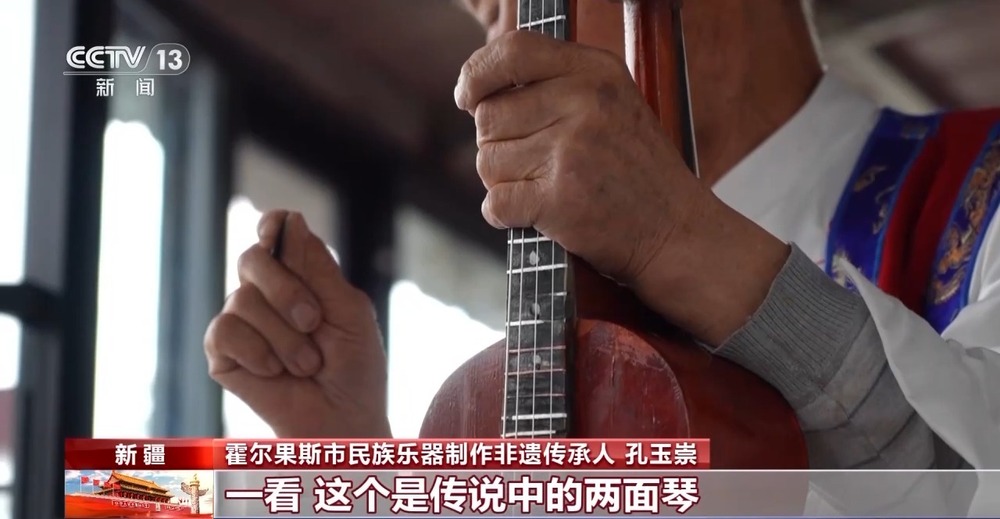 霍爾果斯市民族樂器制作非遺傳承人 孔玉崇:老人畫了一個圖,他問我,這樣的一個琴你能不能做。我一看,這個是傳說中的兩面琴,我說我做,就這樣開始了。