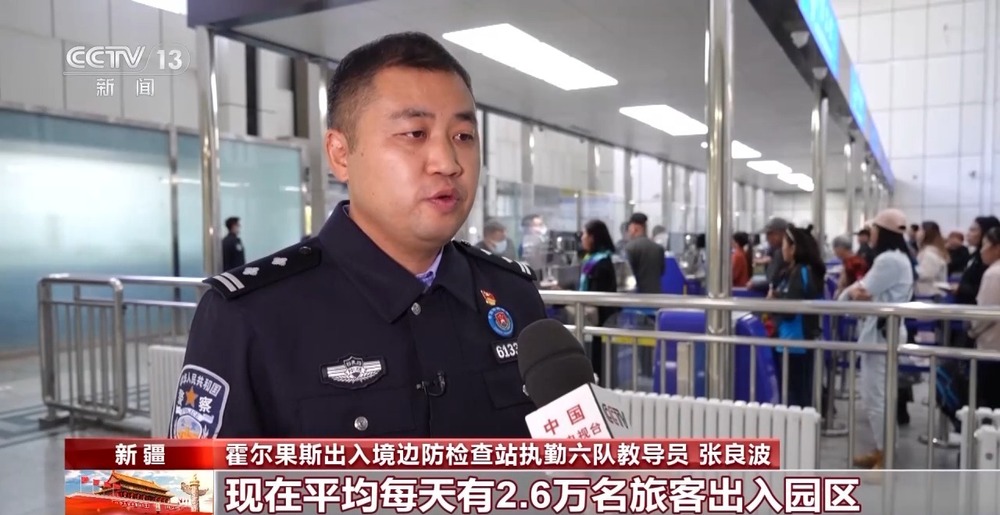 霍爾果斯出入境邊防檢查站執(zhí)勤六隊教導(dǎo)員 張良波:現(xiàn)在平均每天有2.6萬名旅客出入園區(qū),為最大限度保障旅客高效快速通關(guān),我們采取錯時通關(guān)模式。我們也會根據(jù)旅客的流量情況,動態(tài)調(diào)整我們的人工查驗通道,最高可以加開到12條。