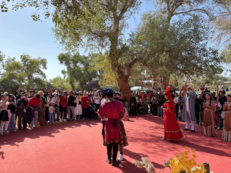 國(guó)慶期間,游客在觀看尉犁縣羅布人村寨景區(qū)民俗表演。 羅布人村寨景區(qū)供圖