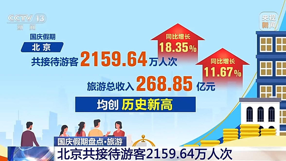 統(tǒng)計數據顯示,國慶假期,北京共接待游客2159.64萬人次,同比增長18.35%;旅游總收入268.85億元,同比增長11.67%,均創(chuàng)歷史新高。文博游、北京中軸線游、京郊游、微度假游、體育賽事游、特色商圈文化街區(qū)游、花燈游、網紅潮玩打卡地游等受到游客青睞。