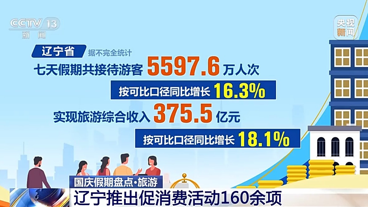 遼寧省據不完全統(tǒng)計,七天假期共接待游客5597.6萬人次,按可比口徑同比增長16.3%,實現旅游綜合收入375.5億元,按可比口徑同比增長18.1%。假期里遼寧省推出促消費活動160余項,全省各地舉辦文化藝術、群眾文化、非遺、文博等各類活動600余場,通過線上線下聯動的方式,豐富人們假日文化生活。