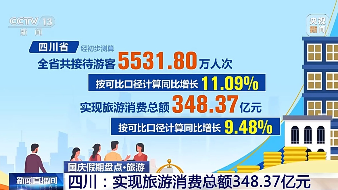 四川省經初步測算,全省共接待游客5531.80萬人次,實現旅游消費總額348.37億元,按可比口徑計算,同比分別增長11.09%和9.48%。全省核心旅游景區(qū)“狀態(tài)拉滿”,17家5A級景區(qū)累計接待游客426.93萬人次、實現門票收入1.85億元,同比分別增長25.06%和15.48%,超越假日歷史最高水平。九寨溝景區(qū)連續(xù)4天均達4.1萬人承載量上限。