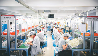 工人在浙江省樂清市奔一新能源有限公司生產線上工作。