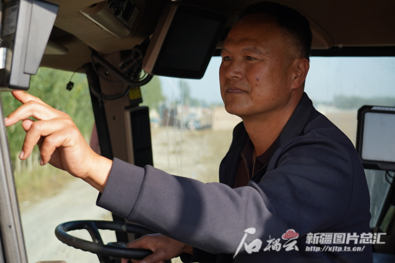 10月10日,何洪濤在采棉機(jī)駕駛室內(nèi)調(diào)設(shè)備。孫志坤 攝