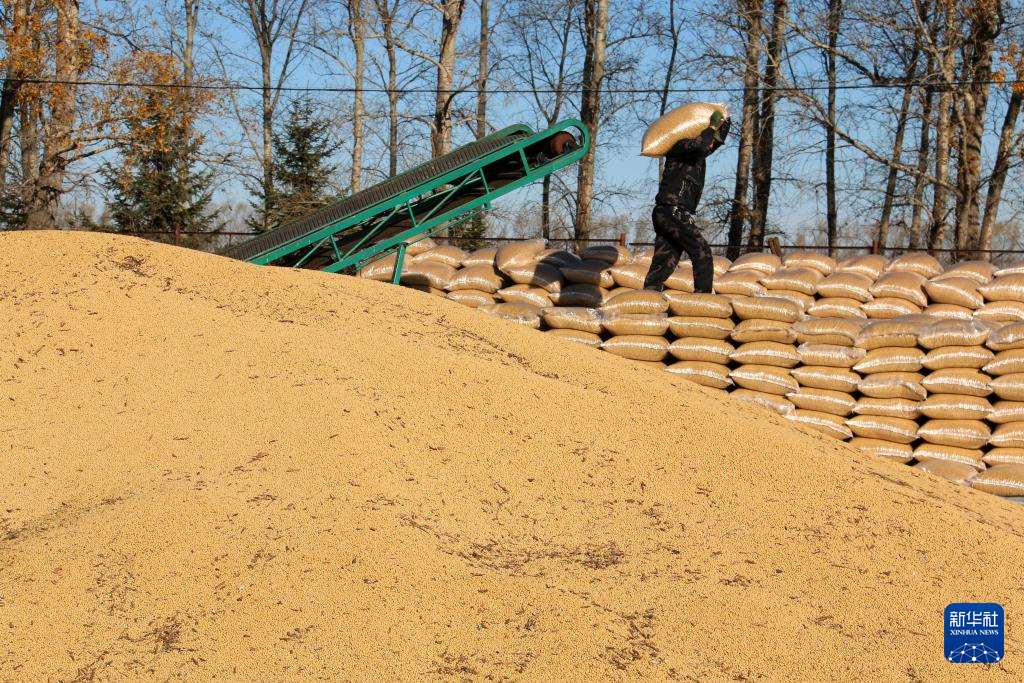 10月3日,在北大荒集團(tuán)黑龍江五大連池農(nóng)場有限公司第一作業(yè)區(qū)糧食晾曬場,種植戶在堆放大豆。新華社發(fā)(陸文祥攝)