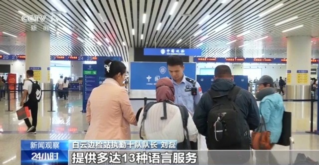 白云邊檢站執(zhí)勤十隊隊長 劉磊:現(xiàn)場這邊的8條通道設(shè)置為廣交會專用通道,包括從廊橋到通道前,全程都設(shè)置了指引標志和引導(dǎo)民警,提供多達13種語言服務(wù)。