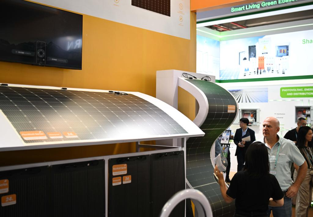 10月15日,境外采購商在太陽能光伏板企業(yè)展臺(tái)洽談。新華社記者鄧華 攝