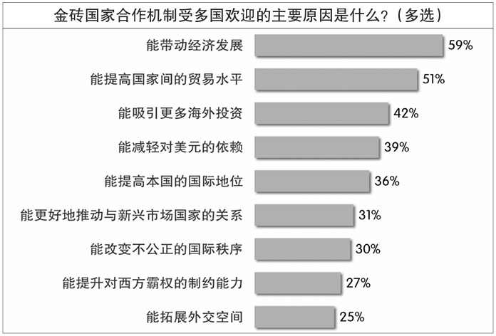 在12國受訪者看來,金磚機制受多國歡迎的最主要原因是它“能帶動經(jīng)濟發(fā)展”,有近六成受訪者認(rèn)同此原因。過半受訪者認(rèn)為,“能提高國家間的貿(mào)易水平”是金磚機制受歡迎的原因。此外,能“吸引更多海外投資”“減輕對美元的依賴”“提高本國國際地位”等原因也獲得較多認(rèn)同。王友明對《環(huán)球時報》記者分析說:“開放、包容、合作、共贏的精神是金磚國家能夠走向‘大金磚’的根本原因,這四個要素缺一不可?!?/p>