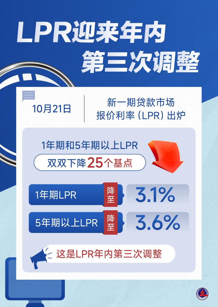 10月21日,新一期貸款市場報價利率(LPR)發(fā)布,1年期和5年期以上LPR雙雙下降25個基點(diǎn),1年期LPR降至3.1%,5年期以上LPR降至3.6%。