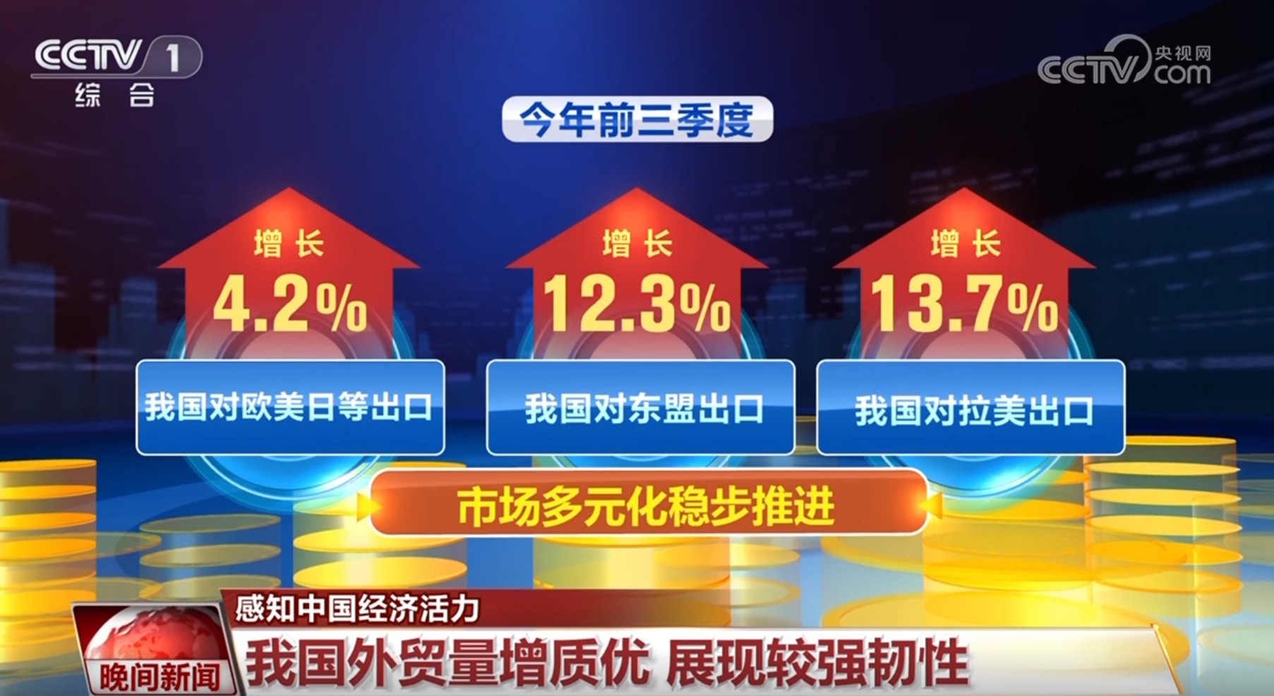 此外,創(chuàng)新也讓中國制造更受青睞。前三季度,我國機(jī)電產(chǎn)品出口增長8%,占出口總值的59.3%。其中,高端裝備出口增長43.4%,集成電路、船舶、通用機(jī)械等高技術(shù)、高附加值產(chǎn)品出口實現(xiàn)兩位數(shù)增長,外貿(mào)結(jié)構(gòu)持續(xù)優(yōu)化。