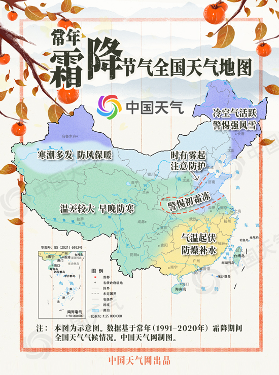 “霜降三旬后,蓂馀一葉秋。”常年霜降節(jié)氣期間,影響我國的冷空氣越來越頻繁,多地天氣由涼轉(zhuǎn)寒,晝夜溫差增大。隨著氣溫走低,冬季的地盤也開始擴張,內(nèi)蒙古、東北大部、山西、河北北部等地往往在霜降時節(jié)步入冬季,秋天最前沿會抵達(dá)江南南部地區(qū)。