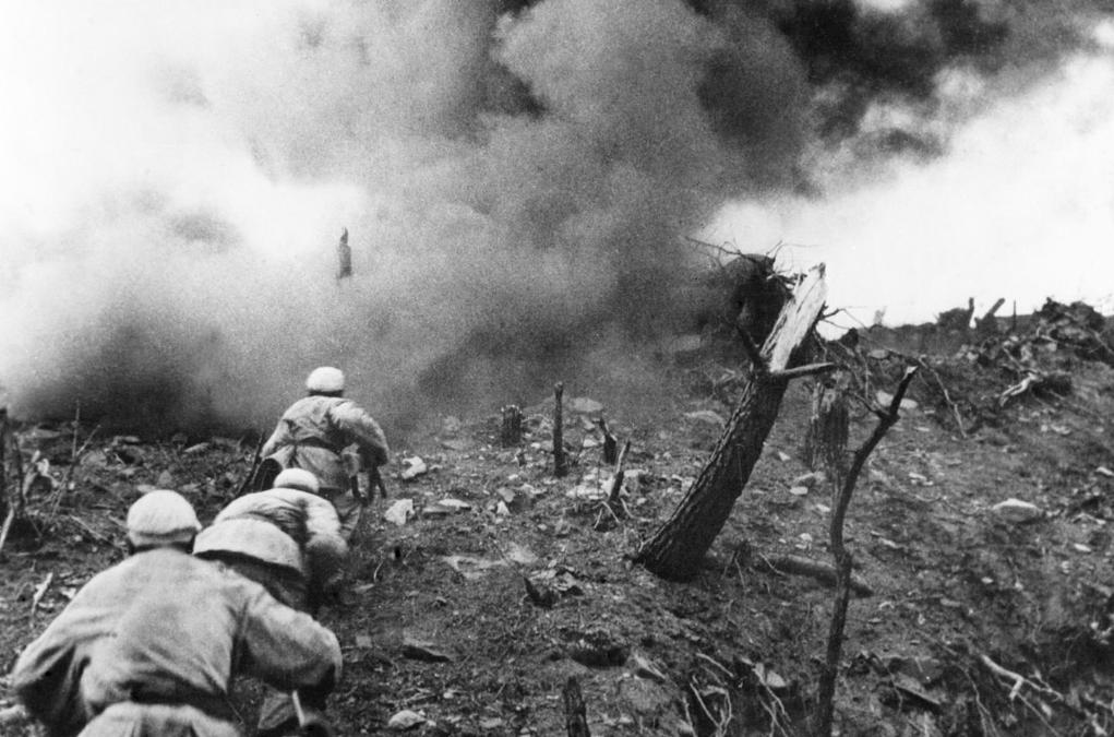1952年,在上甘嶺戰(zhàn)役中,中國人民志愿軍指戰(zhàn)員在炮火支援下,攻上537.7高地北山。