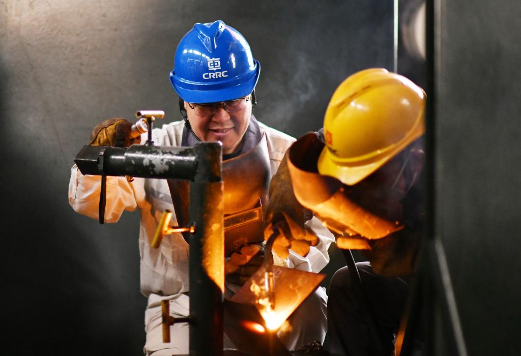 2024年2月4日,中車齊齊哈爾車輛有限公司貨車分廠電焊高級技師、高級工程師王海(左)指導(dǎo)徒弟焊接試件。新華社記者 王建威 攝