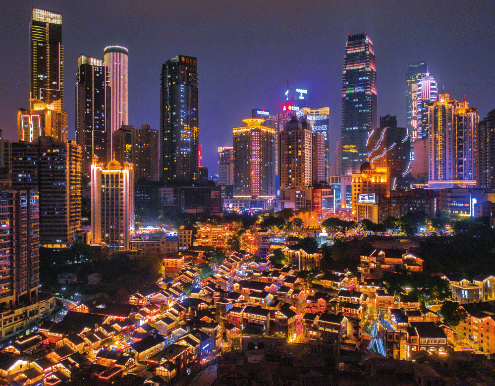 重慶市渝中區(qū)十八梯傳統(tǒng)風(fēng)貌區(qū)和遠(yuǎn)處高樓林立的解放碑 CBD 夜景(2023 年 2 月 10 日攝)黃偉攝 / 本刊