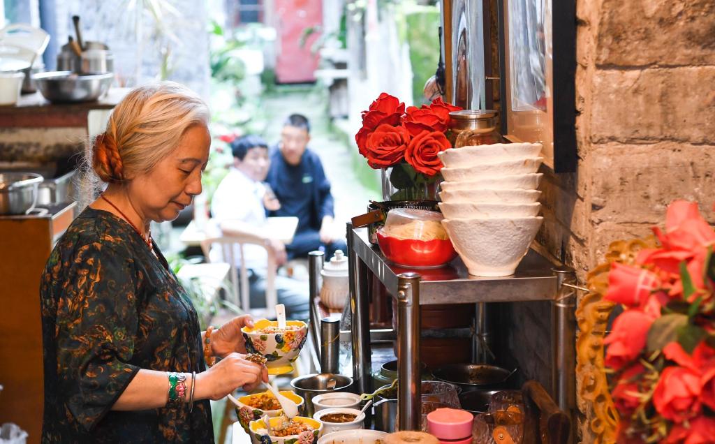 現(xiàn)在周英碧在山城巷經(jīng)營著一家小吃店,旺季時(shí)每天能接待上百個(gè)客人。她最喜歡的事就是閑時(shí)和游客“擺擺龍門陣”,給他們講一講山城巷的故事。
