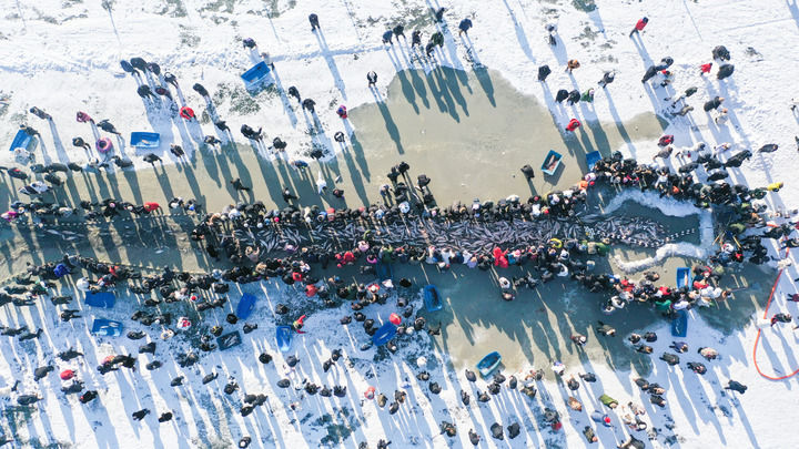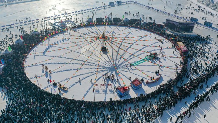 2023年12月28日,游客觀看查干湖冬捕“祭湖醒網(wǎng)”儀式(無人機(jī)照片)。新華社記者 張楠 攝