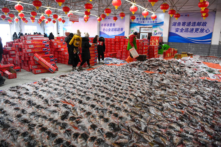 2023年12月27日,游客在查干湖漁場(chǎng)超市選購查干湖魚。新華社記者 張楠 攝