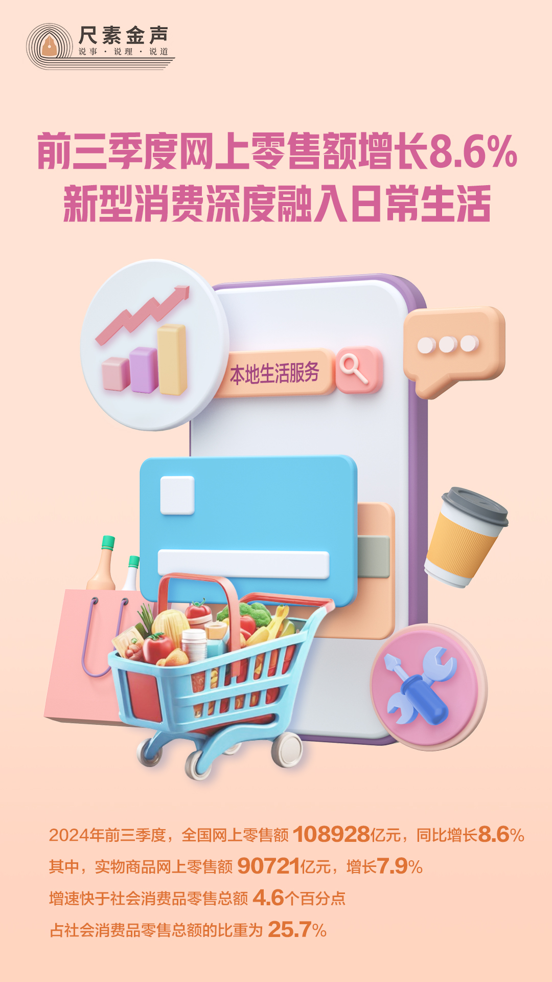 最新數(shù)據(jù)顯示,今年前三季度,全國網(wǎng)上零售額108928億元,同比增長8.6%。其中,實(shí)物商品網(wǎng)上零售額90721億元,增長7.9%,增速快于社會消費(fèi)品零售總額4.6個(gè)百分點(diǎn),占社會消費(fèi)品零售總額的比重為25.7%。本地生活服務(wù)等新型消費(fèi)快速增長,對線上消費(fèi)增長起到明顯的拉動作用。