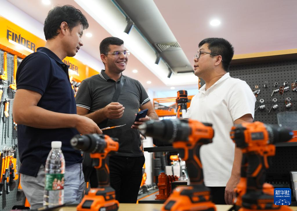 義烏發(fā)現(xiàn)者進出口有限公司銷售部經(jīng)理艾彬(右)向來自突尼斯的客戶介紹鉆頭(10月9日攝)。新華社記者 翁忻旸 攝