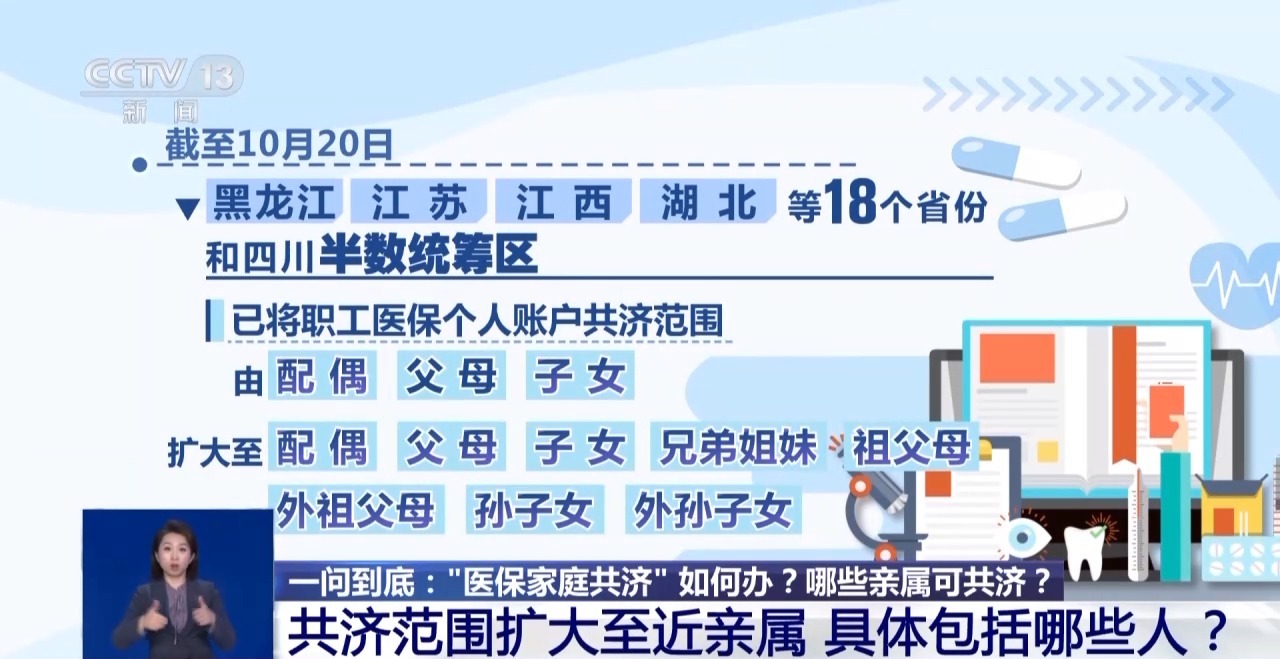 截至10月20日,黑龍江、江蘇、江西、湖北等18個省份及四川半數(shù)統(tǒng)籌區(qū)已將職工醫(yī)保個人賬戶共濟(jì)范圍由“配偶、父母、子女”擴(kuò)大至“配偶、父母、子女、兄弟姐妹、祖父母、外祖父母、孫子女、外孫子女”。