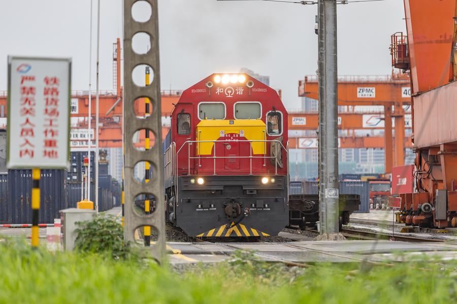 2024年7月30日,在重慶國際物流樞紐園區(qū),一列裝載機械設(shè)備、汽車和筆記本電腦的中歐班列從重慶團(tuán)結(jié)村中心站駛出。新華社記者 黃偉 攝