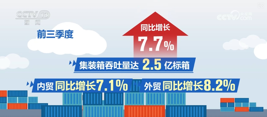 前三季度,全國港口貨物吞吐量129.7億噸,同比增長3.4%。其中,內(nèi)貿(mào)、外貿(mào)同比分別增長1.7%和7.6%。集裝箱吞吐量達2.5億標箱,同比增長7.7%。其中,內(nèi)貿(mào)、外貿(mào)同比分別增長7.1%和8.2%。