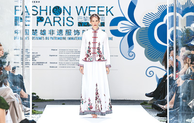 模特在法國巴黎舉行的中國楚雄非遺服飾時(shí)裝展上展示時(shí)裝。