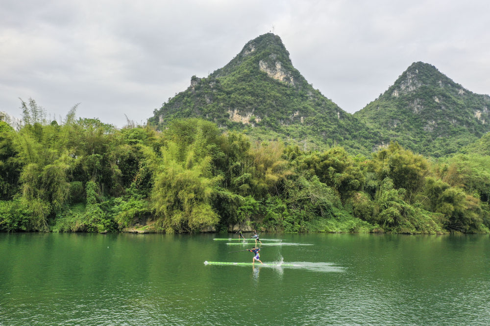 河池學(xué)院獨(dú)竹漂隊(duì)在環(huán)江河上表演。新華社發(fā)(高東風(fēng) 攝)