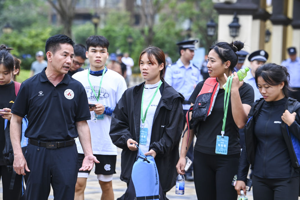 6月19日,藍(lán)建卓(右)在觀看獨(dú)竹漂隊(duì)隊(duì)員的訓(xùn)練。