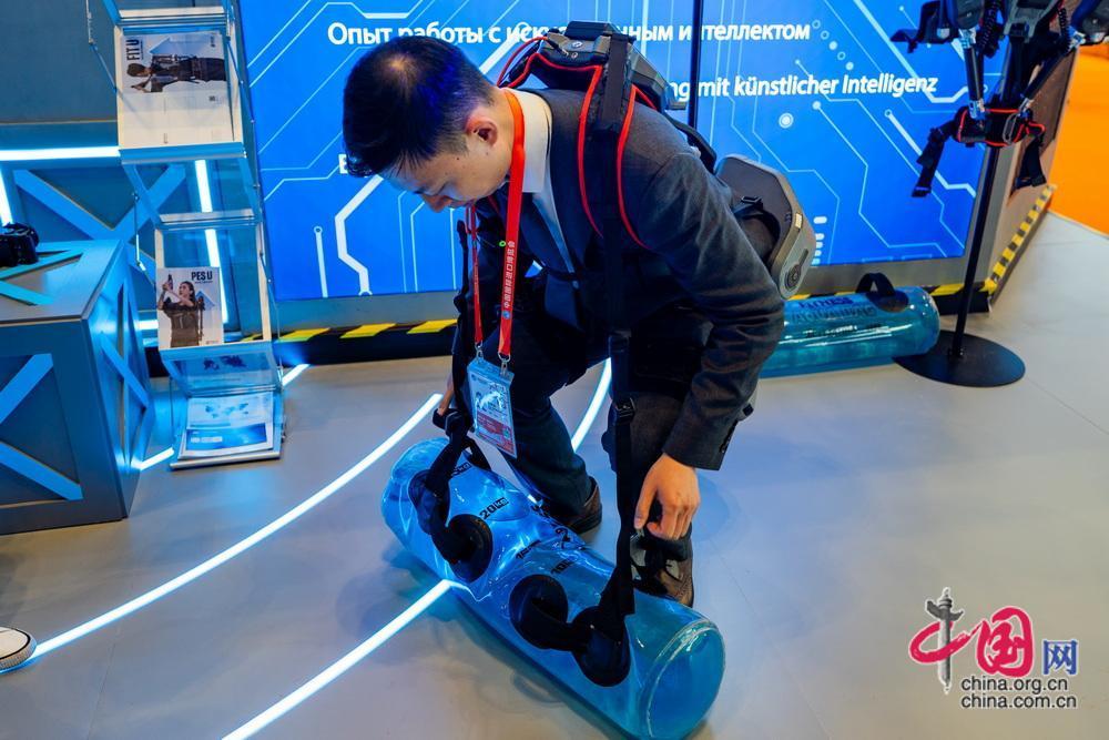 觀眾體驗外骨骼機器人在工作中的實際應用。中國網(wǎng)記者