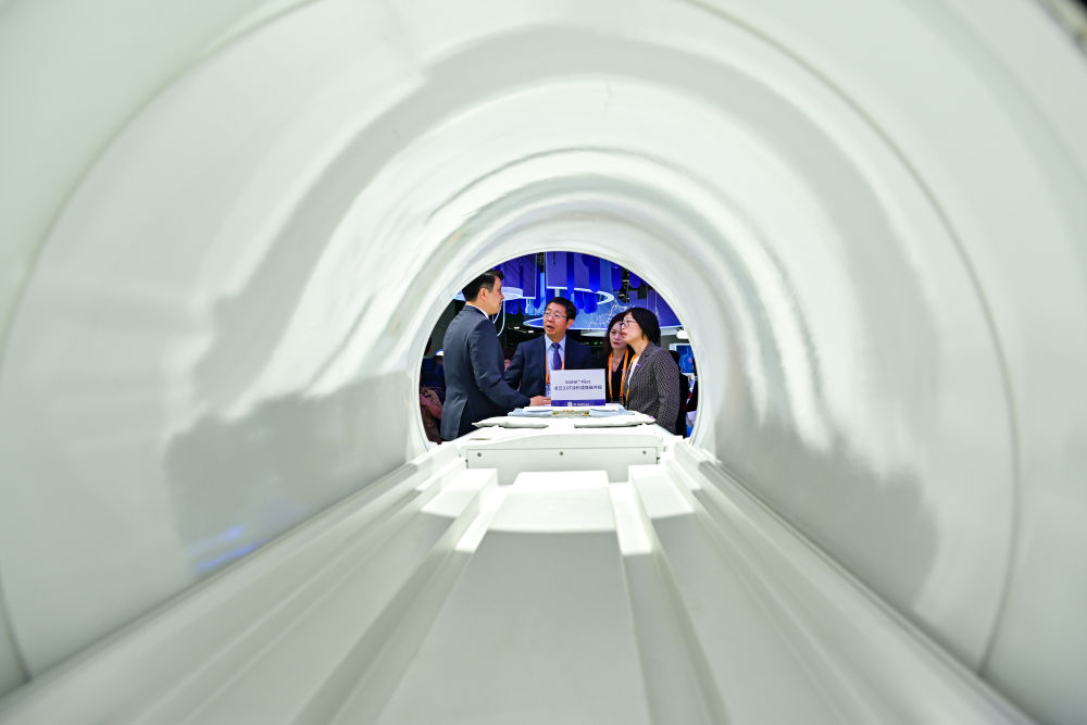 11月5日,人們在第七屆進(jìn)博會醫(yī)療器械及醫(yī)藥保健展區(qū)GE醫(yī)療展臺了解一款讀秒成像磁共振儀器。新華社記者 張鋮 攝
