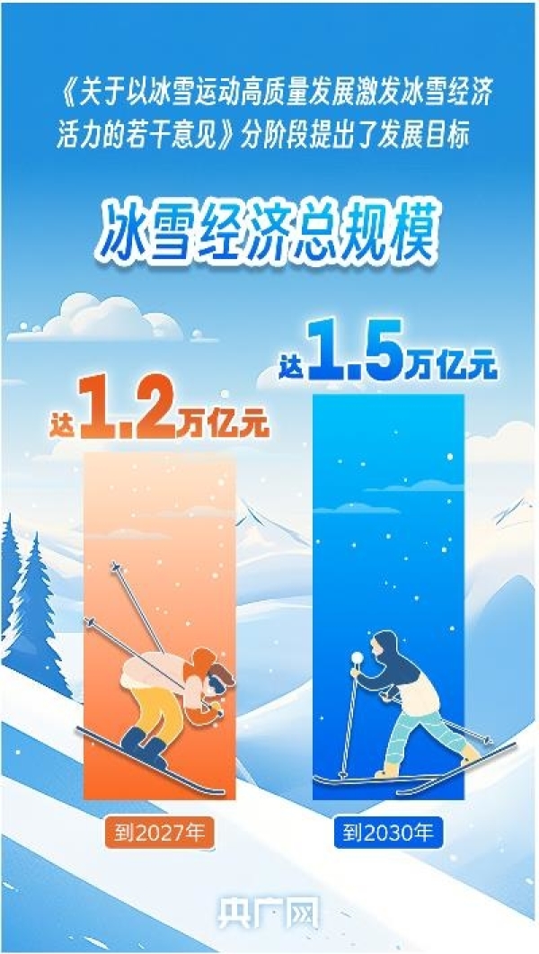近日,國務院辦公廳公開發(fā)布《關于以冰雪運動高質量發(fā)展激發(fā)冰雪經濟活力的若干意見》(以下簡稱《意見》),分階段提出發(fā)展目標:到2027年,冰雪運動場地設施更加完善,服務水平顯著提升,冰雪運動更加廣泛開展,冰雪經濟總規(guī)模達1.2萬億元。到2030年,冰雪經濟主要產業(yè)鏈條實現高水平協調融合發(fā)展,冰雪消費成為擴大內需的重要增長點,冰雪經濟總規(guī)模達1.5萬億元。