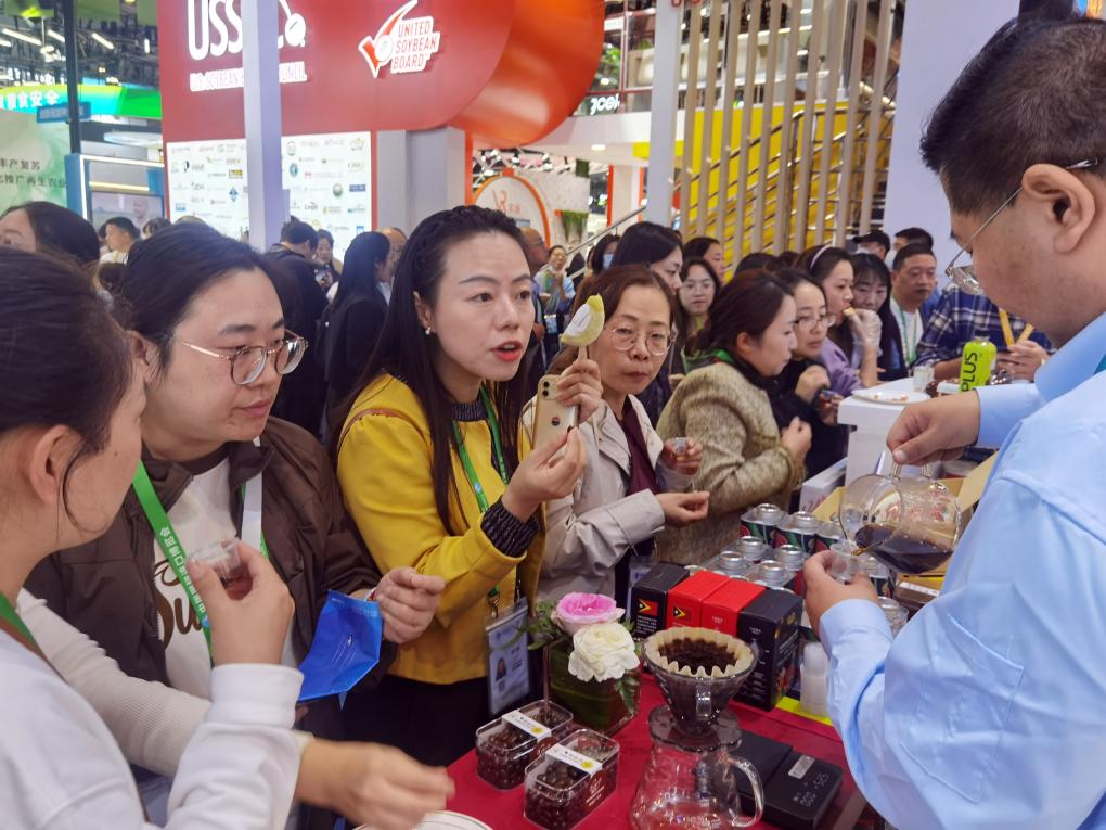 11月8日,采購(gòu)商在東帝汶咖啡展位前駐足,一名參展方代表制作并介紹來(lái)自東帝汶的——“貓典”咖啡。 新華社記者 許曉青 攝