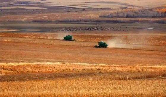 ▲ 大型收割機在進行收割。莫旗融媒體供圖