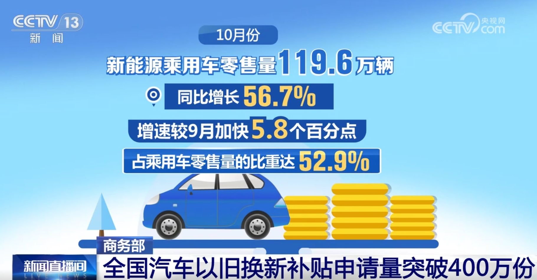商務(wù)部數(shù)據(jù)顯示,截至11月18日24時,全國汽車報廢更新和置換更新補貼申請均突破200萬份,兩者合計超過400萬份。