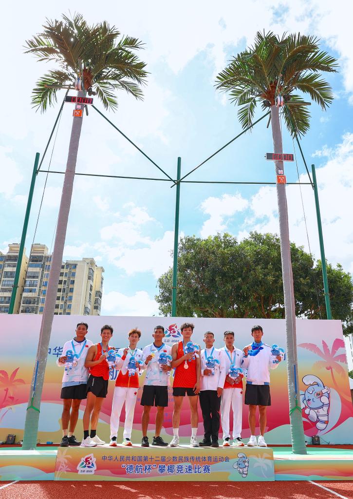 11月24日,獲獎選手在頒獎儀式上合影。當日,第十二屆全國少數民族傳統(tǒng)體育運動會攀椰競速男子9米決賽在西南大學三亞中學體育場舉行。新華社記者 楊植森 攝