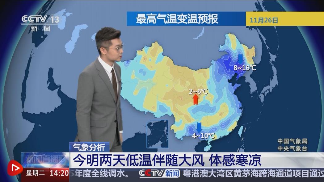 中國氣象局氣象分析師胡嘯表示,寒潮天氣過程將會在11月28日前后趨于結束,但是在結束之前仍要關注大風降溫和強降雪天氣。26日早晨相比25日同一時刻,中東部大部地區(qū)氣溫已經出現明顯的下降,體感寒涼。