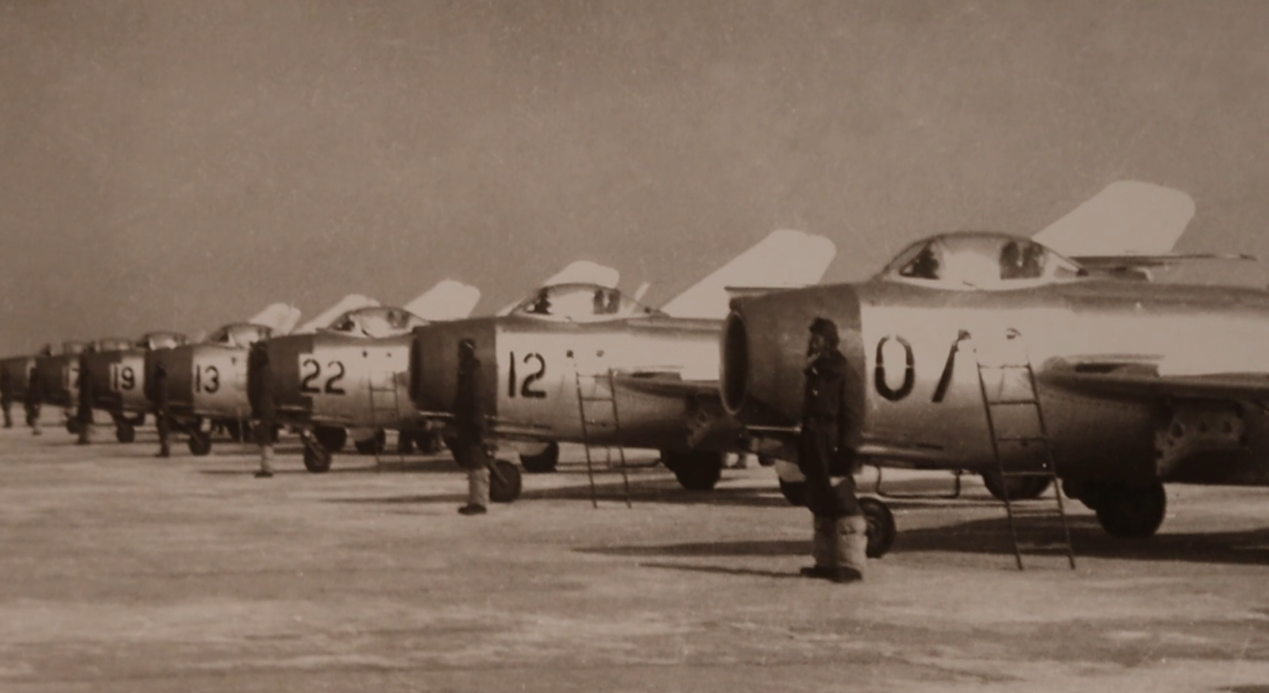 接到命令后,志愿軍空軍第四師第十團(tuán)二十八大隊大隊長李漢率6架“米格-15”型殲擊機(jī)起飛迎擊。年輕的趙志才也在其中,他接替訓(xùn)練時發(fā)生意外而犧牲的朱學(xué)才,擔(dān)任大隊長李漢的僚機(jī)。