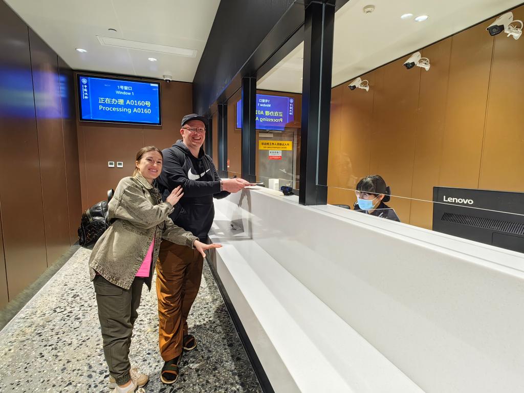 11月24日,正在辦理144小時(shí)過境免簽手續(xù)的俄羅斯旅客。(北京大興機(jī)場邊檢站供圖)