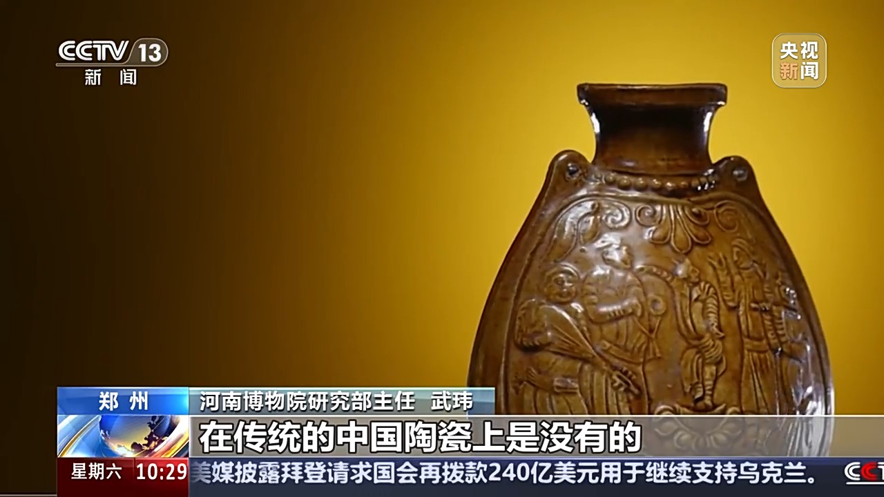 河南博物院研究部主任 武瑋:這種題材實(shí)際上在傳統(tǒng)的中國陶瓷上是沒有的。北朝的時(shí)期整個(gè)社會(huì)對(duì)它的一種崇尚或者一種喜好,才會(huì)出現(xiàn)這樣一個(gè)題材,整個(gè)中西方的交流在深入發(fā)展。