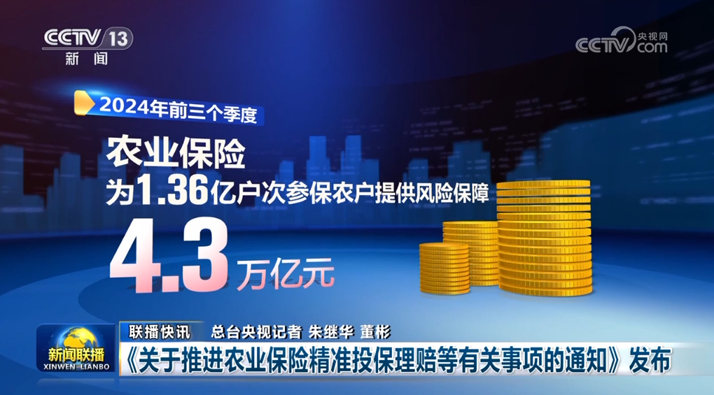 金融監(jiān)管總局等四部門近日聯(lián)合發(fā)布通知,對農(nóng)業(yè)保險投保理賠、應(yīng)收保費、條款費率、數(shù)據(jù)共享等提出要求,進一步提高投保理賠精準性,推動我國農(nóng)業(yè)保險高質(zhì)量發(fā)展。今年前三個季度,農(nóng)業(yè)保險為1.36億戶次參保農(nóng)戶提供風(fēng)險保障4.3萬億元。
