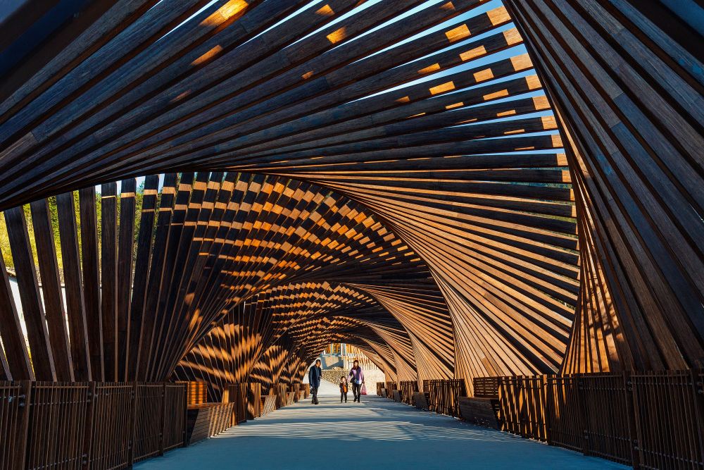 緊接著,設(shè)計(jì)師們聯(lián)手用竹子打造了一個(gè)充滿設(shè)計(jì)感的竹藝村落——龍泉國際竹建筑文創(chuàng)生活村落。