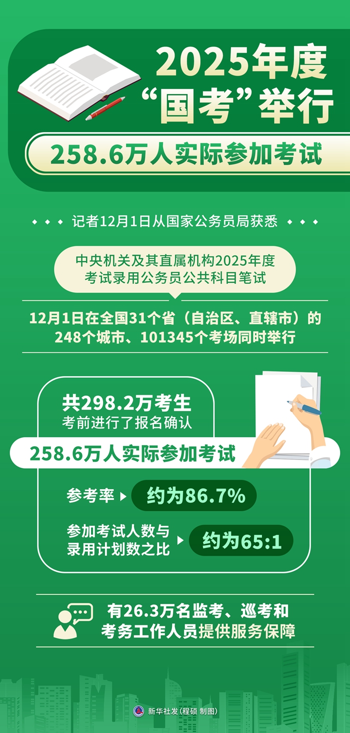 新華社北京12月1日電 記者1日從國家公務員局獲悉,中央機關及其直屬機構2025年度考試錄用公務員公共科目筆試1日在全國31個?。ㄗ灾螀^(qū)、直轄市)的248個城市、101345個考場同時舉行,共298.2萬考生考前進行了報名確認、258.6萬人實際參加考試,參考率約為86.7%,參加考試人數與錄用計劃數之比約為65:1,有26.3萬名監(jiān)考、巡考和考務工作人員提供服務保障。