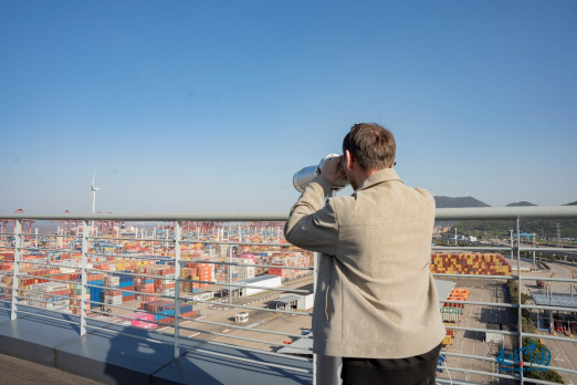 記者們站在觀景平臺(tái),通過望遠(yuǎn)鏡親眼見證了全球最繁忙集裝箱港口之一的現(xiàn)代化作業(yè),他們爭相與壯觀的碼頭場景合影留念。來自哈薩克斯坦《誠實(shí)報(bào)》社會(huì)文化部主任納烏雷茲別克·薩爾沙耶夫在接受環(huán)球網(wǎng)記者采訪時(shí)說道“寧波舟山港的運(yùn)作效率和智能化管理令人贊嘆,它無疑是全球物流行業(yè)的標(biāo)桿。”