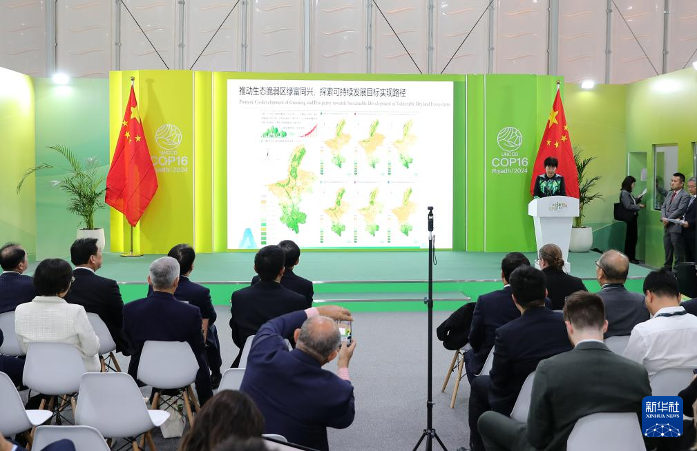 這是12月4日在沙特阿拉伯利雅得《聯(lián)合國防治荒漠化公約》第十六次締約方大會(huì)(COP16)中國館拍攝的邊會(huì)現(xiàn)場?!堵?lián)合國防治荒漠化公約》第十六次締約方大會(huì)(COP16)中國館4日下午舉辦首場邊會(huì),向全球介紹荒漠化防治的“寧夏經(jīng)驗(yàn)”。新華社記者 王東震 攝