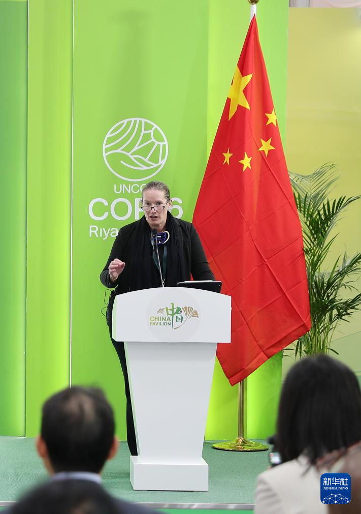 12月4日,在沙特阿拉伯利雅得,世界銀行全球環(huán)境局局長瓦萊麗·希基在《聯(lián)合國防治荒漠化公約》第十六次締約方大會(huì)(COP16)中國館舉辦的邊會(huì)上發(fā)言。新華社記者 王東震 攝