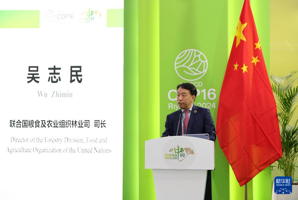 12月4日,在沙特阿拉伯利雅得,聯(lián)合國糧食及農(nóng)業(yè)組織林業(yè)司司長吳志民在《聯(lián)合國防治荒漠化公約》第十六次締約方大會(huì)(COP16)中國館舉辦的邊會(huì)上發(fā)言。新華社記者 王東震 攝