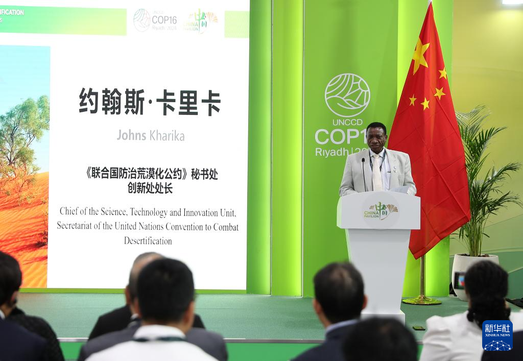12月4日,在沙特阿拉伯利雅得《聯(lián)合國防治荒漠化公約》第十六次締約方大會(huì)(COP16)中國館,《公約》秘書處創(chuàng)新處處長約翰斯·卡里卡在邊會(huì)上發(fā)言。新華社記者 王東震 攝